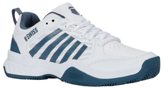 K-Swiss Court Express moški teniški copati so nekoliko širši in namenjeni igri na peščenih igriščih, saj imajo podplat v obliki ribje kosti. Zagotavljajo udobje, stabilnost in dobro blaženje, zgornji del iz sintetičnega usnja pa nudi oporo in zračnost. Podplat iz gume Aosta 7.0 poskrbi za dodatno vzdržljivost.